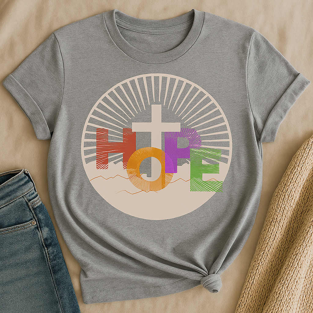 🌞 Rise with HOPE — Wear What Lifts You Light up the day with our Radiant HOPE Tee, a powerful blend of faith, art, and bold expression. Featuring vivid lettering and a radiant sun motif wrapped around a central cross, this design is more than just eye-catching — it's soul-stirring.